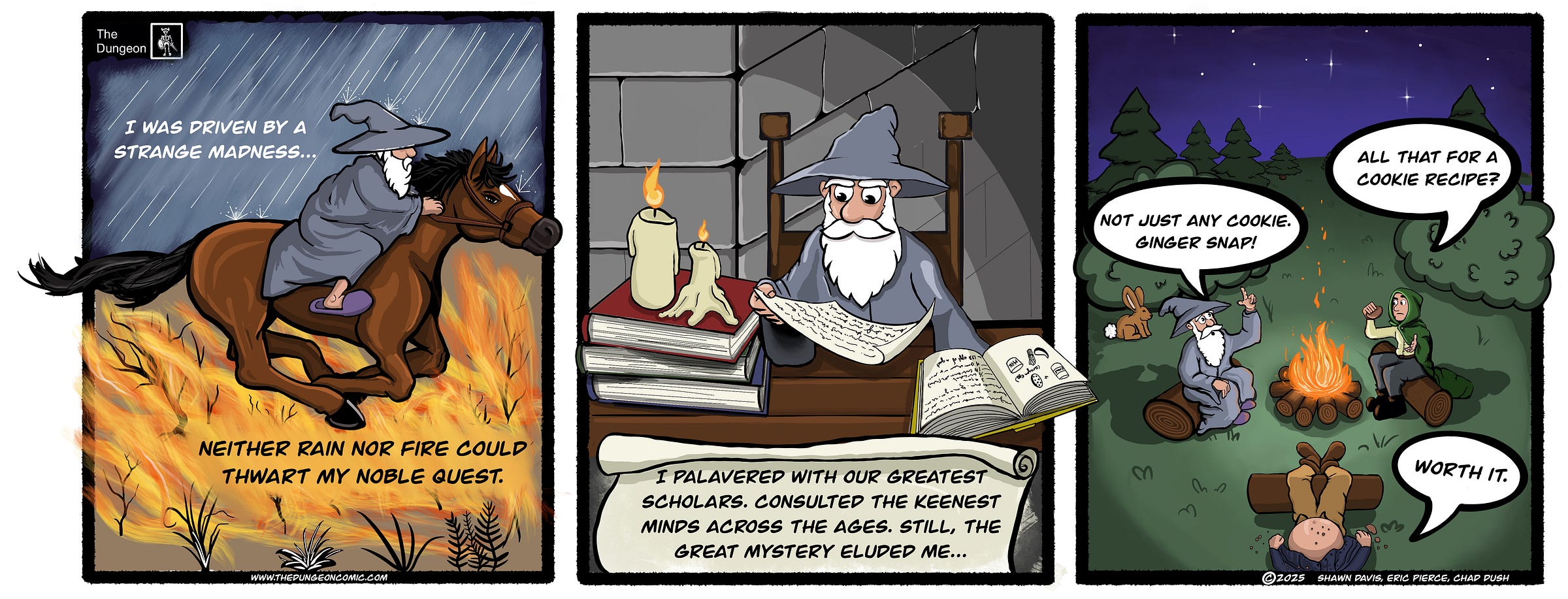 The parallels to Gandalf in The Fellowship of the Ring are obvious and intentional; our wizard is basically Gandalf with 50% more dementia and 100% more fireball. But—to stick with percentages—I’m 99% sure Tolkien included a footnote in one of the appendices that stated Gandalf was late to the Shire because he was chasing ancient cookie lore after getting baked on Hobbit weed.